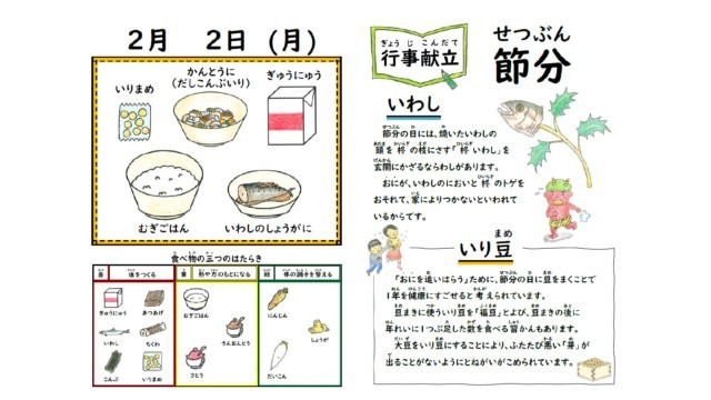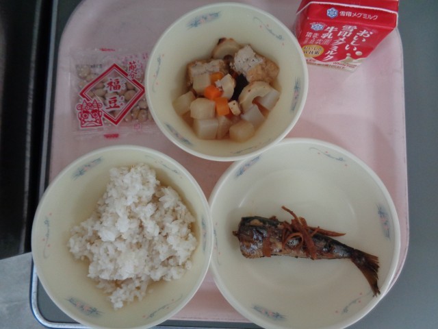節分の行事献立なので「いわしのしょうが煮」と「いり豆」が出ました。