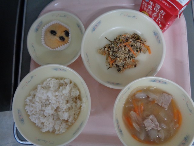 米粉や三温糖、ベーキングパウダー、サラダ油で生地を作り、1人分ずつカップに入れて、黒豆を乗せてスチームコンベクションオーブンで焼きました。