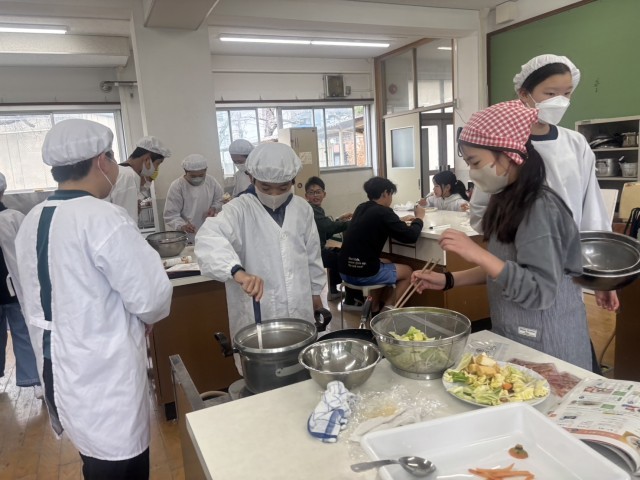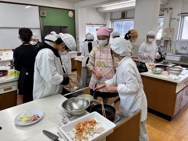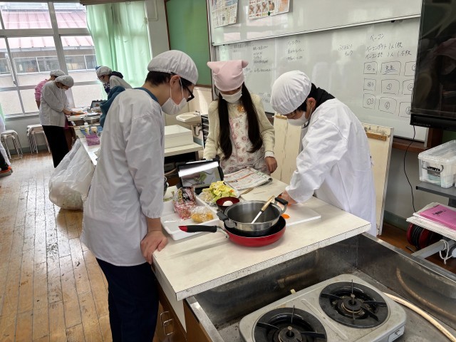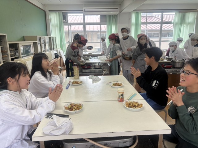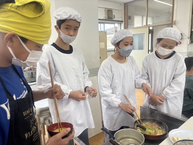今日は2・3組の調理実習をしました。みんなで協力して楽しんで調理する様子が見られました。役割を分担し、それぞれが活躍している様子が見られました。「ゆでる」「いためる」をすることで野菜が柔らかくなり、おいしかったと話していました。ぜひ家でも実践してもらいたいところです。
