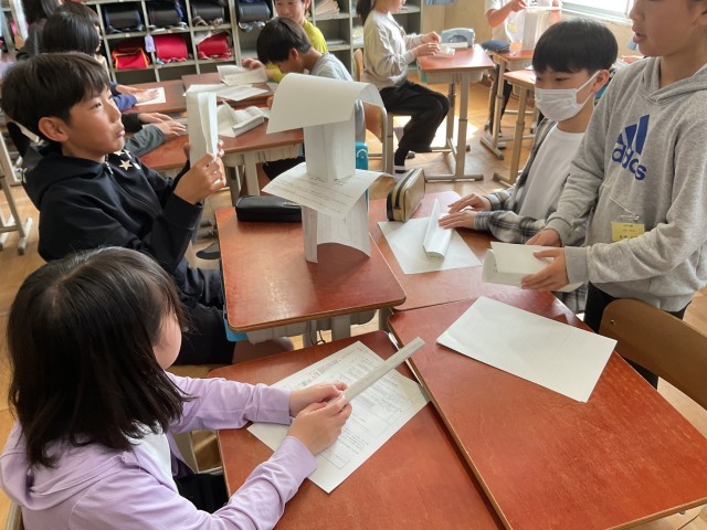 理科では学習の流れを掴むために、紙をどのように工夫すれば高く積み重なるのかみんなで考え、挑戦していました。