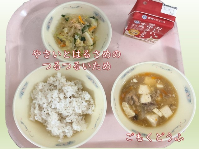 今日の献立は、「麦ごはん・牛乳・五目どうふ・野菜とはるさめのつるつるいため」でした。