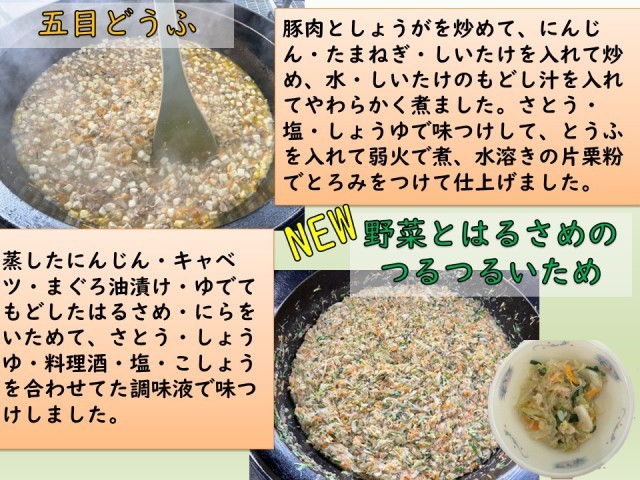 野菜とはるさめのつるつるいためは、新献立です。蒸したキャベツ・にんじんと、ツナ・にらをいためてはるさめと合わせました。ツナのうまみやニラの香りのきいた野菜と、はるさめのつるっとした食感が楽しめる献立です。こちらも子どもたちに人気でした。