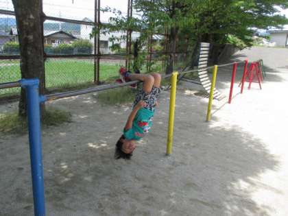 梅雨の間のある晴れた日の昼休みの様子です。鉄棒をしたり,遊具をしたり・・・。