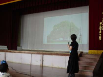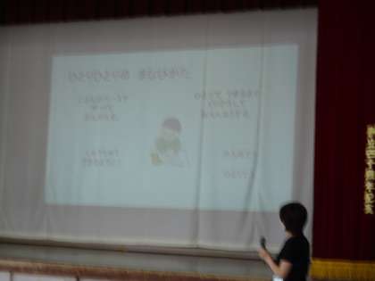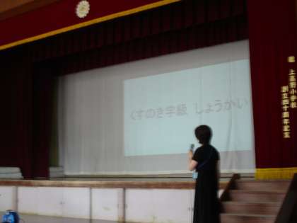 はじめに校長先生のお話があり,その後,くすのき学級の担任の先生から,毎日それぞれのペースでいろいろな学習に取り組んでいることや,ひとりでできるように,さまざまな取組を繰り返して練習していることなど,全校のみんなに伝えていただきました。最後に,くすのき学級の子どもたち一人ひとりから,自分のすきなことやがんばりたいことを,みんなへ伝えました。