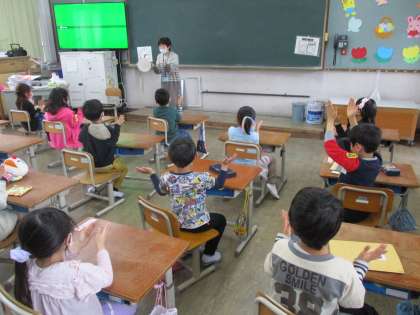 先生のリズムうちを真似して,同じようにリズムうちをしました。「先生の音をよく聞いてね」,「はーい」と楽しそうにリズム遊びをしました。