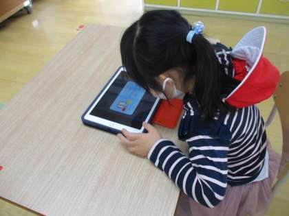 タブレットを使って絵を動かしたり形を合わせたりする活動をしました。