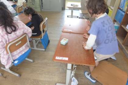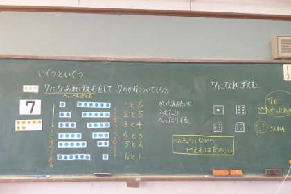 算数科の「7はいくつといくつ」の学習をしました。この日は,数図ブロックを使って,7がいくつといくつに分かれるのかを考えました。その後,友達とペアになり,さいころを使って「7になあれ ゲーム」をしました。さいころを転がして,二人のさいころの数が7になったときは「やった!」と声が上がり,とても喜んでいました。