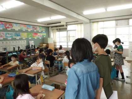 1年生にとってはドキドキでしたが,6年生が1年生の教室へお迎えに行って,たてわりグループの教室へ優しくエスコートしてくれました。そのおかげで1年生の顔はみんなにっこりでした。