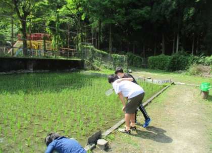 その後,田んぼで大きく成長したオタマジャクシやカエルを見つけて観察していました。