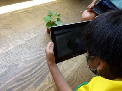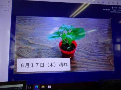 理科では,以前蒔いたツルレイシの子葉から本葉が出て,マキヅルが伸びてきています。今日は,ICT機器をつかって,写真を撮りました。定期的に写真で成長の記録を残していく予定です。
