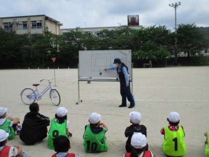 4年生が自転車教室を行いました。下鴨警察署交通課の警察官の方に来ていただき,自転車の安全点検の仕方や,安全な乗り方について教えていただきました。