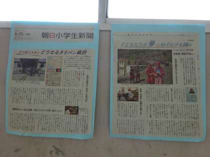 4年生の国語科では,「ランドセルは海を越えて」の学習を終えました。今,話題になっているアフガニスタンのお話で,子ども達も作者が事実について伝えたルポルタージュに大変興味をもって,読んでいました。図書館司書から,子ども新聞のアフガニスタンの情勢いついての記事もいただき,廊下に掲示してさらに,世界に目を向ける機会になればと思っています。