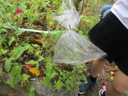 あさがおのつぼみを探し,おしべをとり袋をかけました。