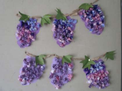 「ぶどう」は木の実の汁で染めた和紙や色紙を丸めてつくりました。