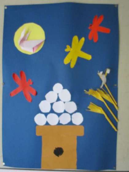 「お月見」は高学年がお月見団子や満月をつくったところに,低学年がつくったトンボが飛んで,ほのぼのとした作品になりました。