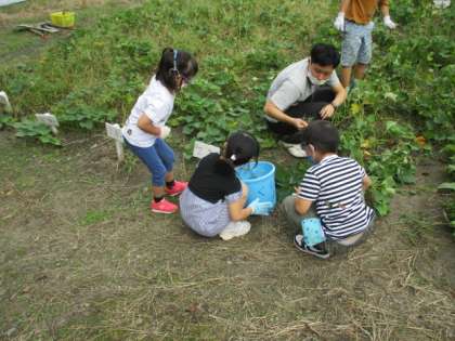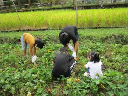 しばらく草抜きをしていなかったので,大きく育った雑草がいっぱいになっていました。みんなで一生懸命に抜くと,だんだんサツマイモの葉と土が見えるようになってきました。彼岸花やカニを見つけたり,大きく育った稲の穂を眺めたりして自然をたくさん感じました。