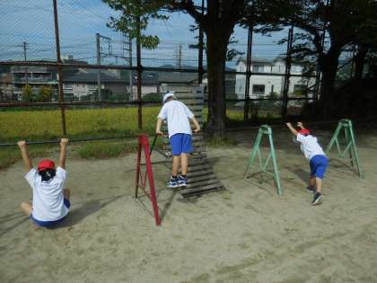 普段それぞれの学年で交流学習を行っている体育を,先週と今週は低学年3人で取り組みました。先週はふれあいサロンに行って様々な曲でリズムダンスをしました。今週は,運動場でてつぼう遊びや遊具遊び,ボールつきリレーに取り組みました。みんなのびのびと学習に取り組めました。