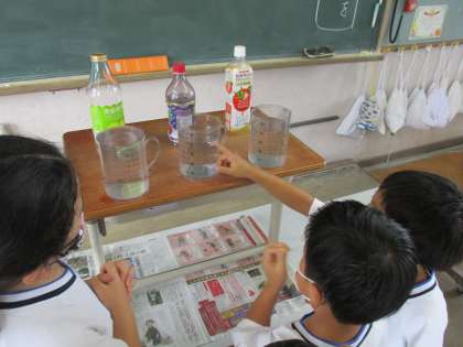 かさを比べる学習では,はじめに予想し,実際に入れ物の水を移し替えてかさを比べました。入れ物の見た目だけでは比べられないので,どのようにして比べるのかをみんなで話し合いました。1年生は,実際に試してやってみることがとても大切ですね。予想したことを実際にやってみることで理解が深まります。できるだけ体験的な活動を取り入れていきたいと思います。