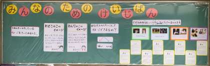 体育館前の「みんなのためのけいじばん」。10月は2年生の学習の足跡です。