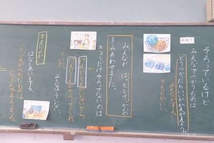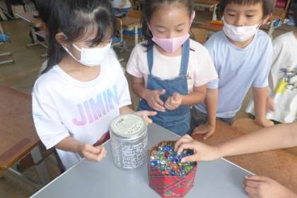 道徳の単元『そろっているけど』では,『みんなが使う場所や物を大切にしよう。』をねらいとして学習しました。みんなの物を大切にすると自分も周りの人も嬉しい気持ちになることを実感しました。学習シートには、これからもみんなが使う場所や物を大切にしようとする気持ちが書かれていました。そこで、トイレのスリッパをそろえることを目標にしました。トイレのスリッパを揃えたら、ビー玉を入れることにしました。ビー玉が増えるたびに、スリッパが綺麗に揃えられると思うと嬉しいです。