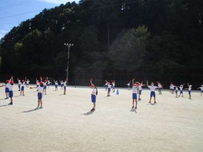 運動参観にむけて,4年生が運動場に出て団体演技の練習をしました。