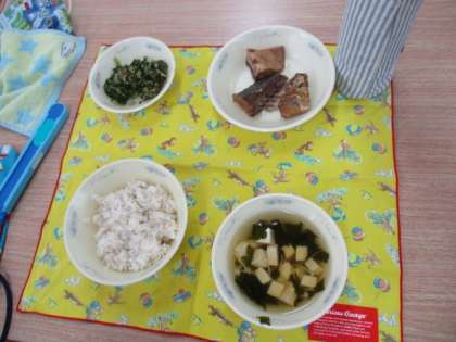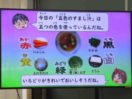 今日の給食は,麦ごはん・五色のすまし汁・大根葉のごまいため・さばのみそ煮の「和(なごみ)献立」でした。テレビで,和献立の紹介も見ました。五色のすまし汁は,白・黒・黄・赤・緑の色を彩りよく合わせて作られていました。子どもたちは,パクパクと美味しそうに食べていました。