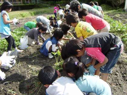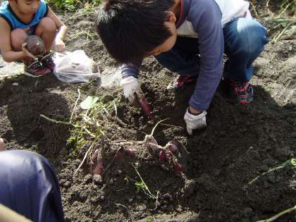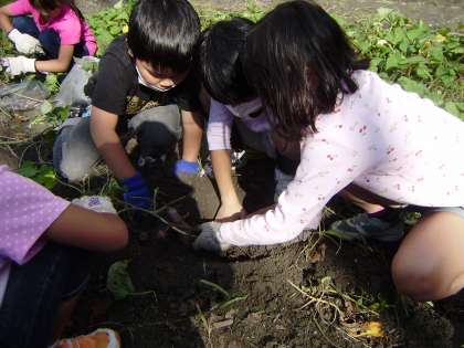 10月6日 に楽しみにしていた「いもほり」をおこないました。抜きやすいように、校長先生たちがつるをきってくれました。みんな勢いよくほり始め、あっという間においもをほり出しました。大きいおいもは、ほるのに大変で友だちに協力してもらいました。とっても重いのに、みんなにこにこしながら、うれしそうにおいもを運んでいました。
