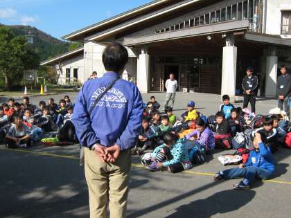 そしていよいよ最後の日。みんなで思い出を発表し合って,花背山の家での活動を締めくくりました。インストラクターの先生ともお別れ。ちなみに,写真下の真ん中の建物が男子が宿泊し,いろんな活動の拠点となったミーティングルームのある宿泊棟です。