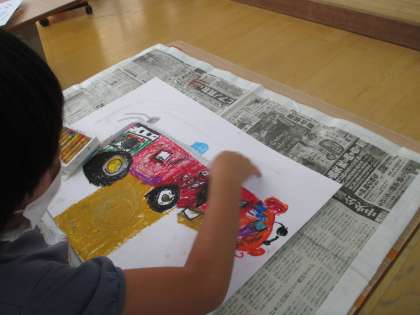 2年生が図画工作の時間に消防車の絵を描きました。たくさんの写真の中から、1番描きたいと思う消防車を選びました。ボンプ車で、一つ一つの部品もよく見てパスで丁寧に描いていました。次回、絵の具で仕上げる予定です。