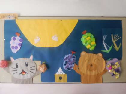 テーマをみんなで話し合い、果物やお月見に関するものなどそれぞれ自分の作りたい方法で作りました。
