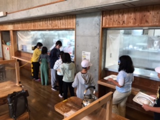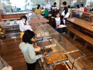 山の家の食堂で朝ごはんです。しっかり食べて、元気に活動します。