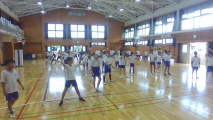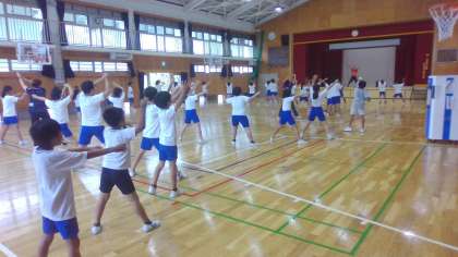 運動会の練習をがんばっています。12345678…。カウントに合わせて動きをそろえています。がんばろう!