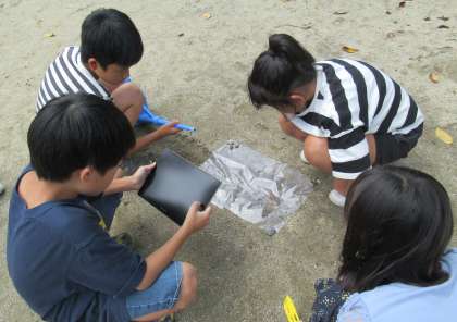 はじめは、運動場の地面の傾きを調べ、傾いている面に