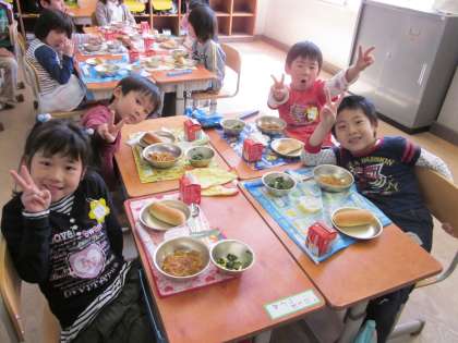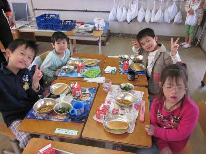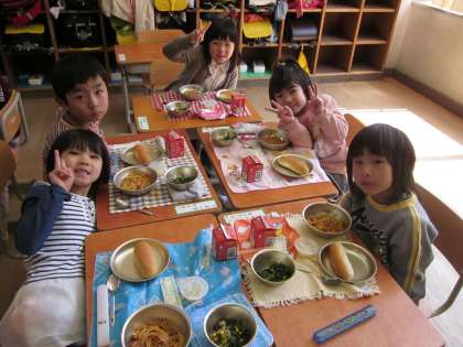 いよいよ待ちに待った給食です。大きな声で「いただきます」をして食べ始めました。