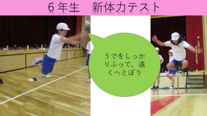 立ち幅跳び・・・腕をしっかりふって、勢いをつけてその場で前に跳びます。腕の振りが重要ですが、うまくタイミングが合わないとなかなか遠くへ跳べません。昨年の記録を更新できましたか?