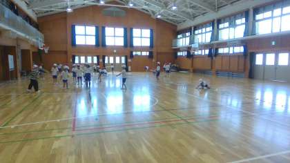 体育の学習で、とびあそびをしています。ゴムとびやけんぱをして、運動を楽しみました。