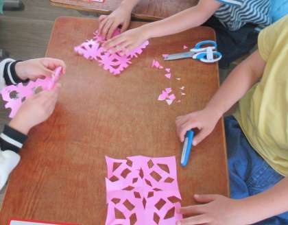 図画工作科で、折り紙を使って飾りづくりをしています。