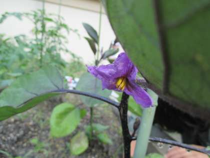 学級園で育てている野菜に水やりをした後、雑草抜きをしました。ナスの花が美しく咲いていました。ピーマンの実が大きくなっていたので、2つ収穫しました。