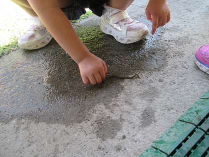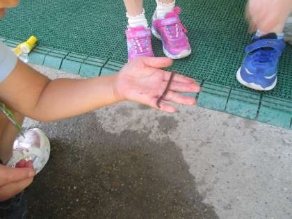 子どもたち渡り廊下の辺りで、何かを取り囲むように円になってしゃがんでいました。何を見ているのかなと思って見に行くと…ミミズでした。「さわってもいい?」とおそるおそる触ってみる子、ためらいなく捕まえて手に乗せる子と生き物を囲んで楽しい時間を過ごしました。