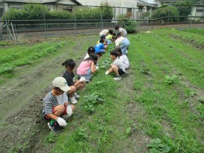 5月末に植えたさつまいもの苗のまわりに、たくさんの雑草が生えています。たくさん抜いてくれましたが、今日だけでは抜ききれなかったので、今後も続けていきたいと思います。おいしいおいもができますように。