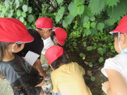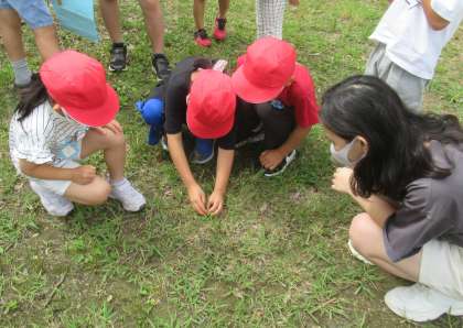 6年生とグループをつくり、夏さがしや夏の遊びを楽しみました。バッタを追いかけたり、草花を観察したりと、自然に触れあいながら6年生との仲を深めることができました。