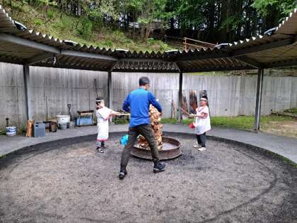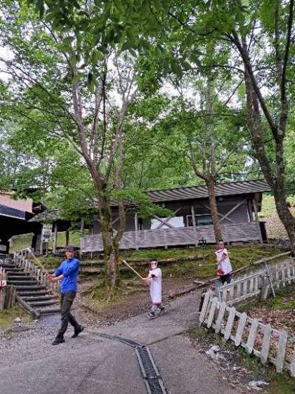 火の子2人(自主自律挑戦の火・友情と協力の火)が校長先生と練習しています。