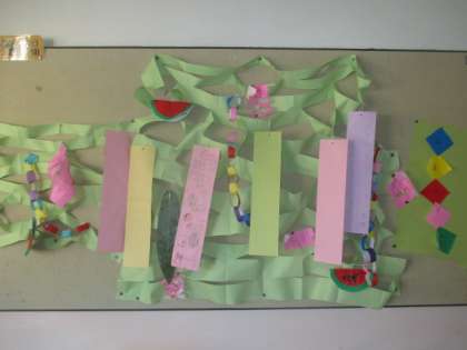 今月は、七夕飾りを作りました。色紙ですいかや輪飾りなどを作りました。そして、一人ずつ短冊に願い事を書きました。それぞれ、やりたいことや、できるようになりたいことなどを書いていました。
