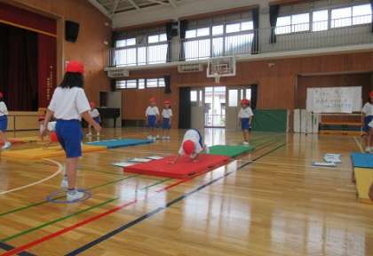 いろいろな動物になりきって歩いたり、マットの上でゆりかごや前・後ろ転がりなどの技に挑戦したりします。