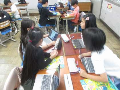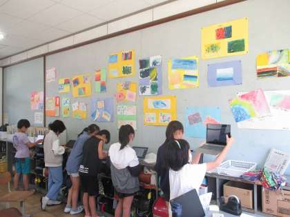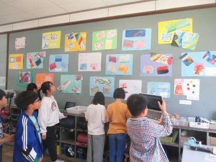 みんなの作品を見ながら、自分の作品と比べたり、友だちのいいところを見つけたりして、「心のもよう」の鑑賞を行いました。グループで自分の作品の説明をし、友だちの作品のいいところを伝え合いました。