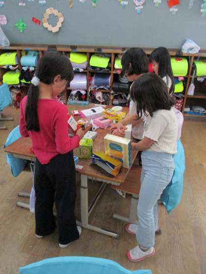 身の回りにある立体をよく観察することで、形の特徴を捉え仲間分けすることができました。友だちとわいわい楽しそうに作る姿が、微笑ましかったです。