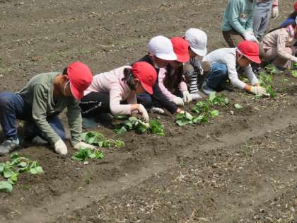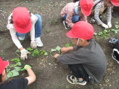 学校の畑にサツマイモの苗を植えました。