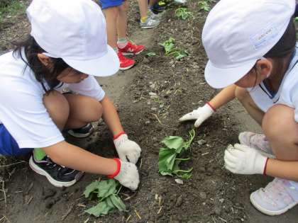 植え方を聞き、葉を隠さないように気をつけて、茎に土をしっかりかけて植えました。
