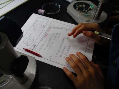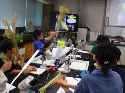 1組は、「イネのひみつ」をテーマに学習しました。実際にイネを触り、皮をむいて顕微鏡で調べたり、ヨウ素液につけたりしながらイネの秘密に迫りました。