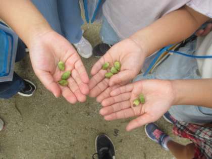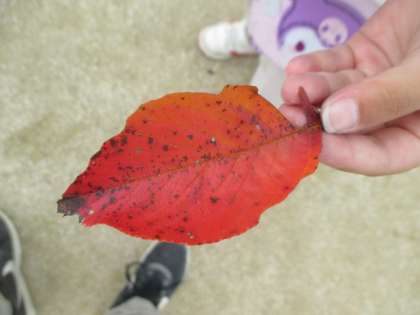 「きれいな葉っぱを見つけた」「何かはわからないけど、実を見つけたよ」など、子どもたちそれぞれが感じる秋を見つけられました。見つけた葉っぱも「赤い葉っぱ」「きれいな葉っぱ」など、子によって表現が違うのがおもしろいです。